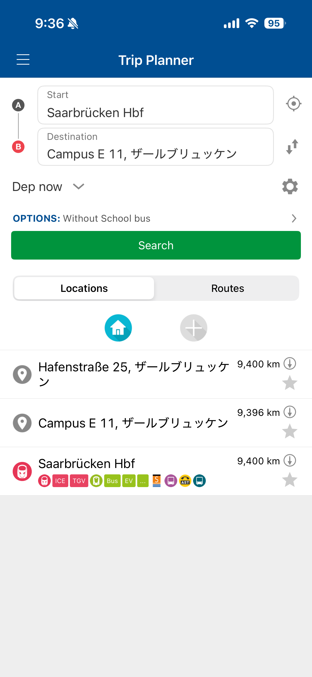 Saarfahrplanというスマホアプリをダウンロードし、出発地と目的地(場所でもバス停名でもよい)を入力すると、ちょうどよいバスやトラムが表示されます。